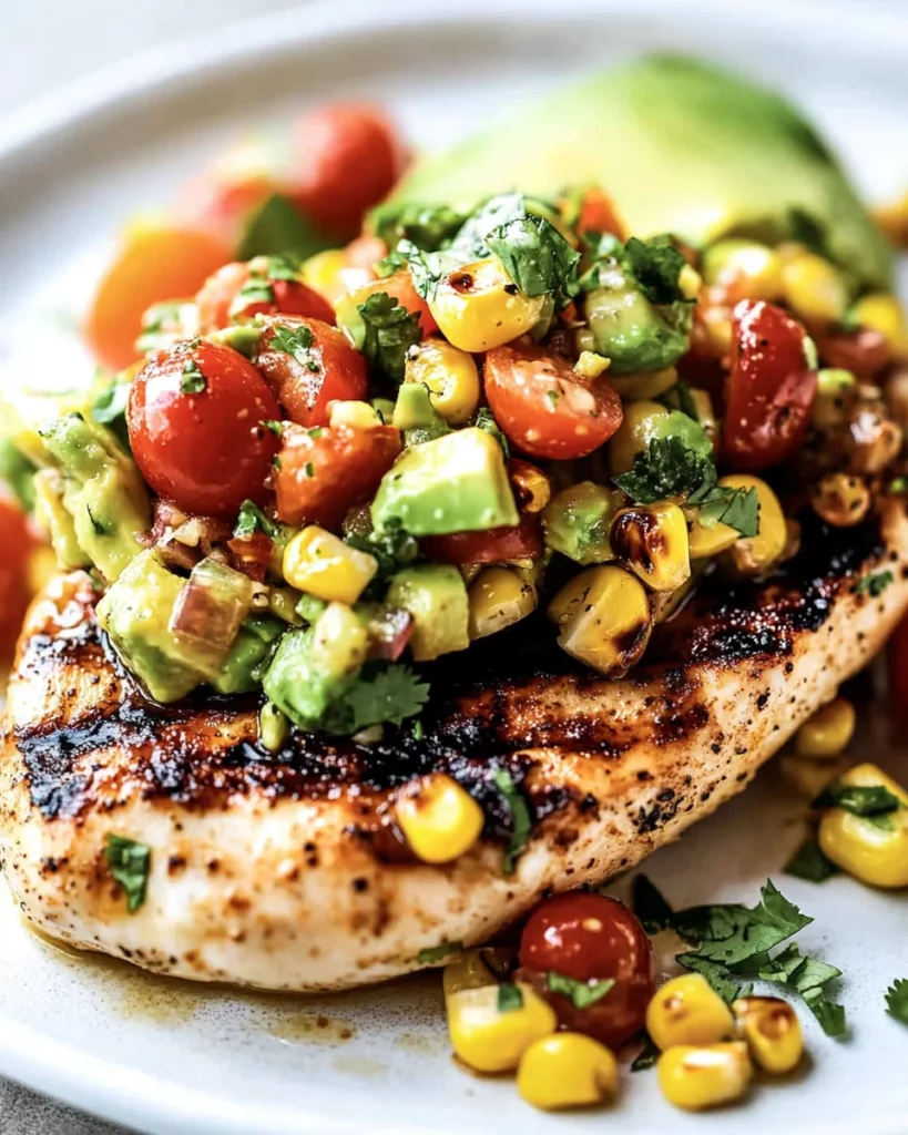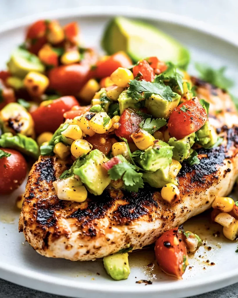 Slice the rested chicken and serve it alongside the avocado salsa. It’s a vibrant plate full of color and flavor that’s sure to impress everyone at the table. Enjoy your culinary creation!
