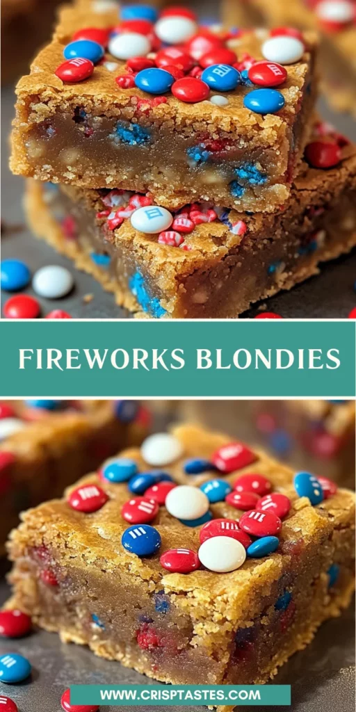 Fireworks Blondies are a festive and sweet treat filled with colorful M&Ms and sprinkles, perfect for any celebration.