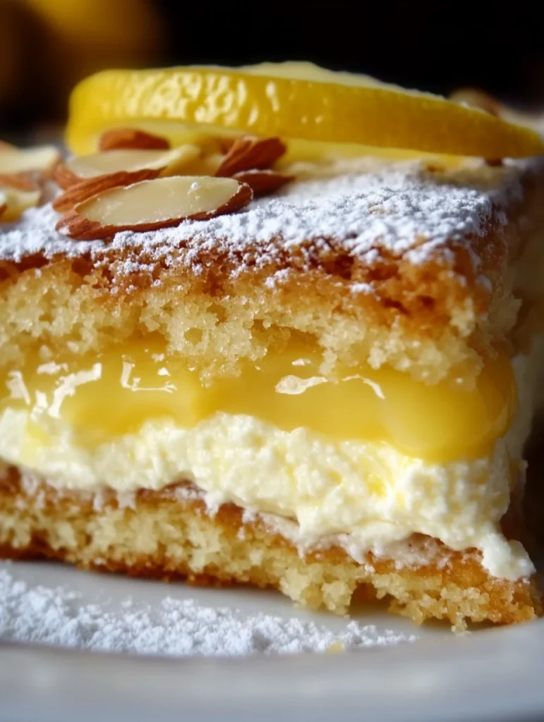 Top with toasted sliced almonds, a dusting of powdered sugar, and lemon slices. Refrigerate for 1 hour before slicing and serving.