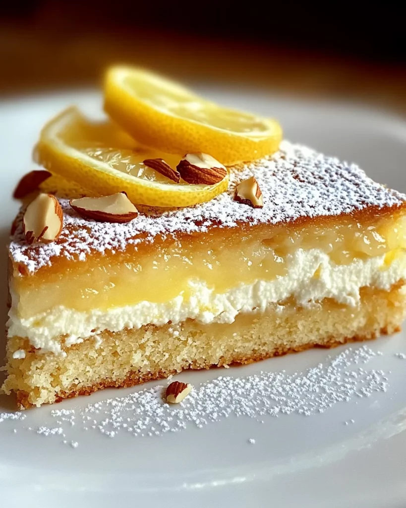 Top with toasted sliced almonds, a dusting of powdered sugar, and lemon slices. Refrigerate for 1 hour before slicing and serving.