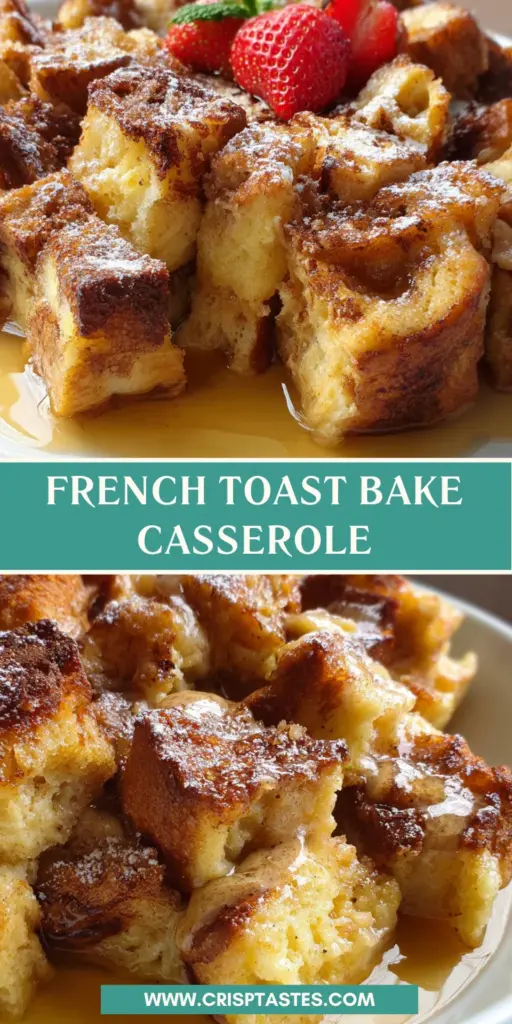 This French Toast Bake Casserole isn’t just a recipe; it’s a heartwarming experience that brings loved ones together around the breakfast table. The joy of sharing a warm, delicious meal creates cherished moments, transforming ordinary mornings into special occasions. I encourage you to make this comforting dish a staple in your breakfast routine. Imagine the smiles as everyone digs into that golden goodness! Whether it’s a casual family gathering or a festive brunch, this casserole is sure to be a hit. Embrace the love of home cooking, and let this dish warm both hearts and bellies.
