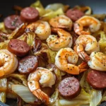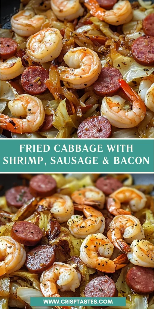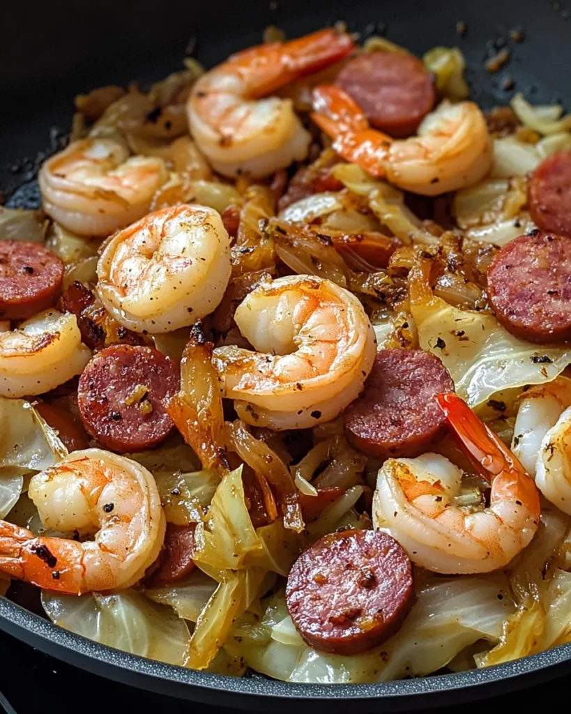 A delightful one-skillet dish with fried cabbage, shrimp, sausage, and bacon, combining savory flavors for a satisfying meal.