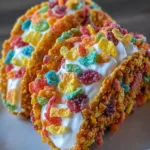 Fruity Pebbles Cheesecake Tacos are a fun and delicious dessert that combines the nostalgic flavor of Fruity Pebbles cereal with a creamy cheesecake filling, all served in a taco-shaped shell made from the cereal.