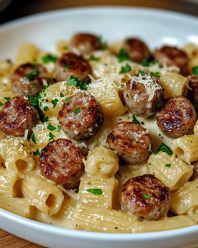 A delicious dish featuring garlic butter sausage bites served with creamy Parmesan pasta.