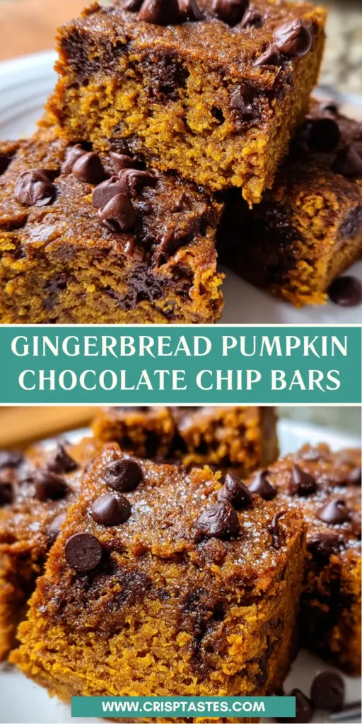 These Gingerbread Pumpkin Chocolate Chip Bars are a delightful fusion of warm spices, pumpkin flavor, and sweet chocolate chips, perfect for any fall treat.