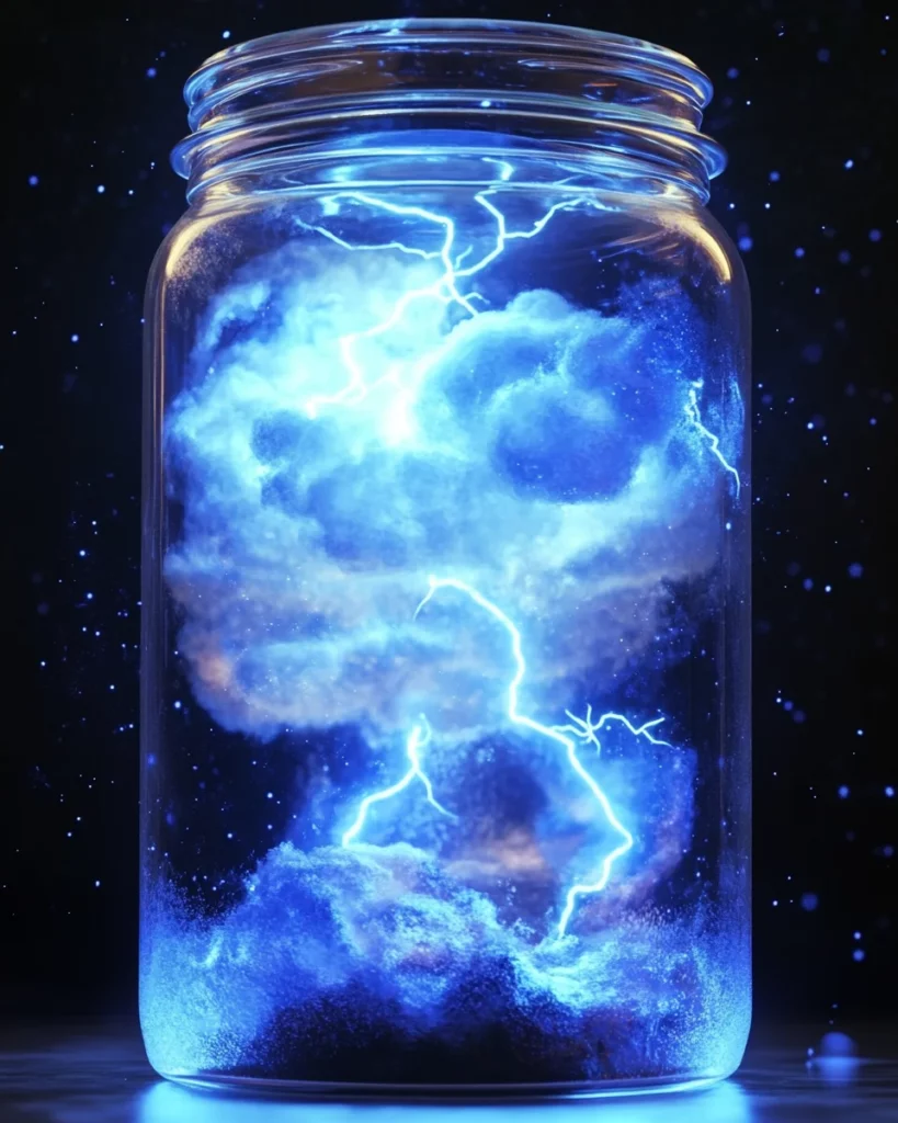 A captivating, glowing storm in a jar that mimics lightning and thunder with swirling colors perfect for science fun and mesmerizing displays!