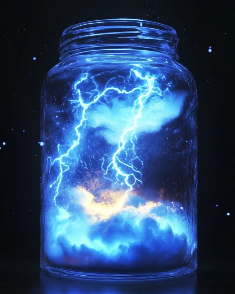 A captivating, glowing storm in a jar that mimics lightning and thunder with swirling colors perfect for science fun and mesmerizing displays!