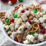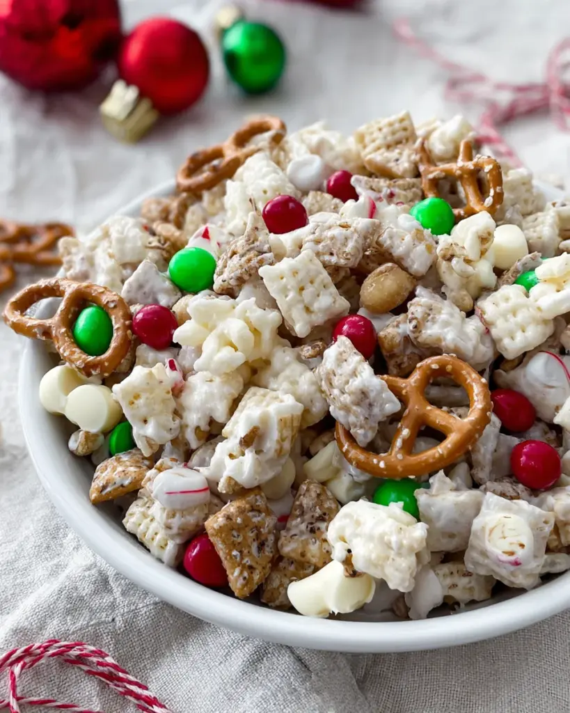 A festive and delicious treat that combines Chex mix, popcorn, pretzels, and peanuts coated in melted white chocolate and topped with Christmas sprinkles.