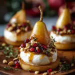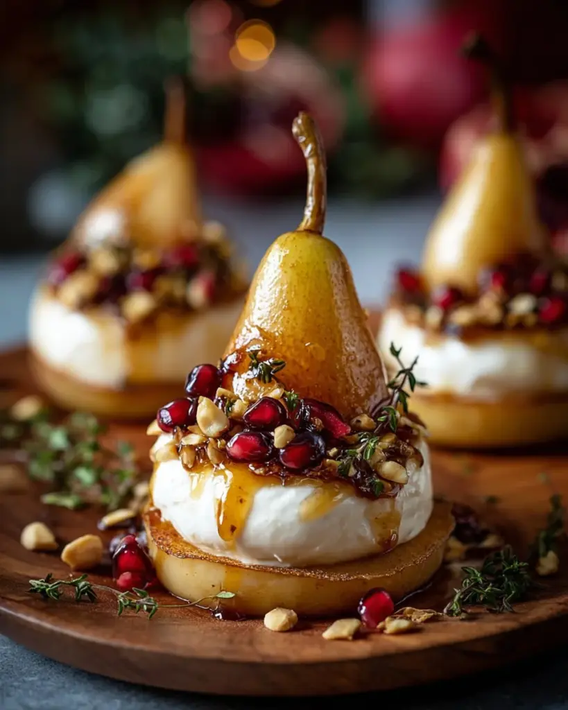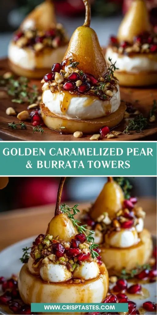 Golden Caramelized Pear & Burrata Towers is a delightful dessert that combines poached pears with a creamy burrata and mascarpone filling, topped with a warm caramel glaze and pomegranate seeds.