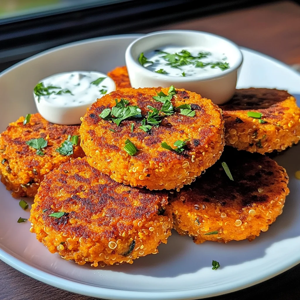 ✨ Serve the Golden Quinoa Sweet Potato Patties warm with the Tangy Lemon Garlic Yogurt Dip on the side.