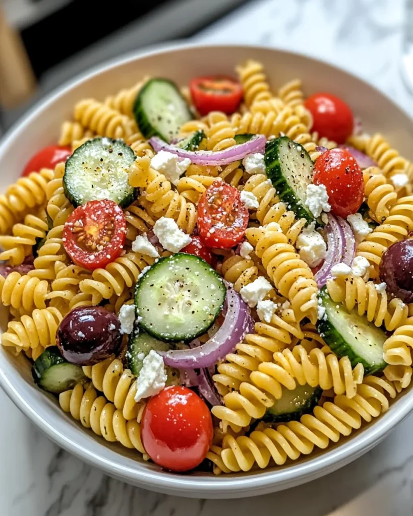 A refreshing and vibrant Greek Pasta Salad perfect for summer gatherings.