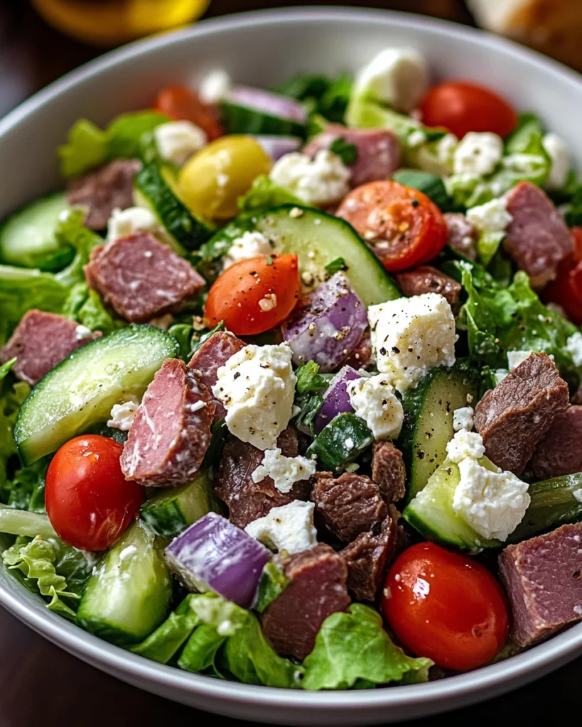 A flavorful twist on traditional Greek salad featuring a variety of meats and fresh vegetables.