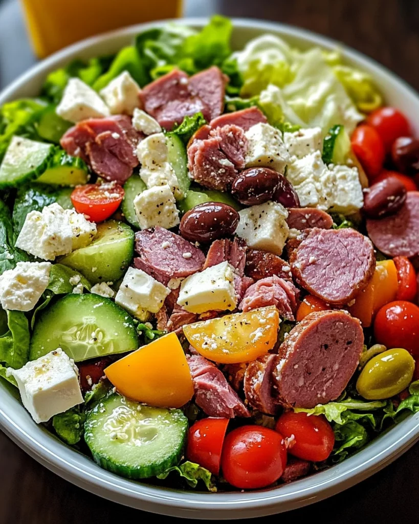 A flavorful twist on traditional Greek salad featuring a variety of meats and fresh vegetables.