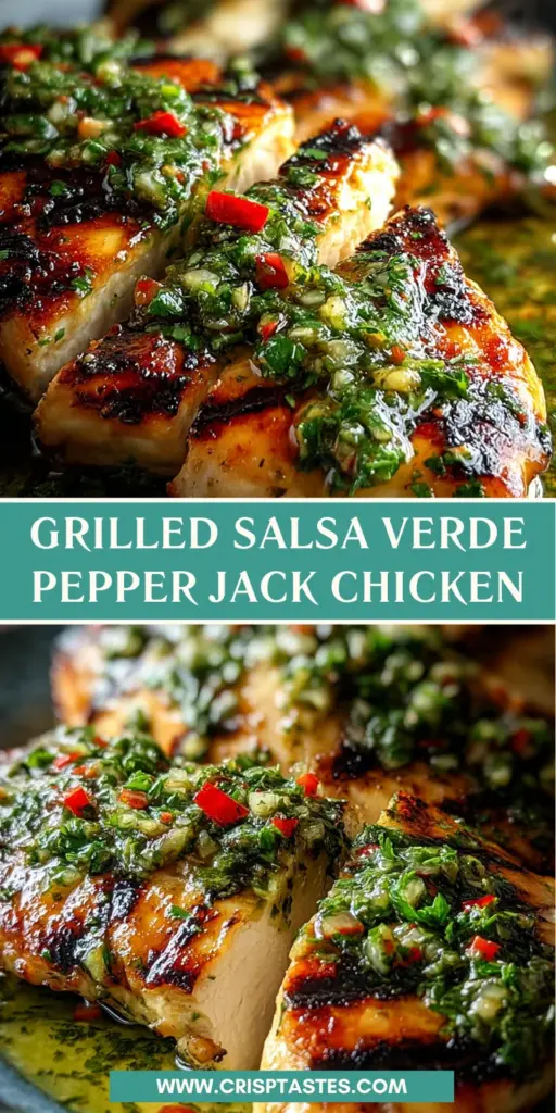 Grilled Salsa Verde Pepper Jack Chicken is a flavorful dish combining marinated chicken breasts with zesty salsa verde and melted pepper Jack cheese.