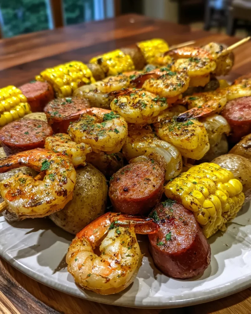 Grilled Seafood Boil Skewers are a delightful summer dish featuring shrimp, sausage, potatoes, and corn, all perfectly seasoned and grilled to perfection.
