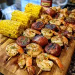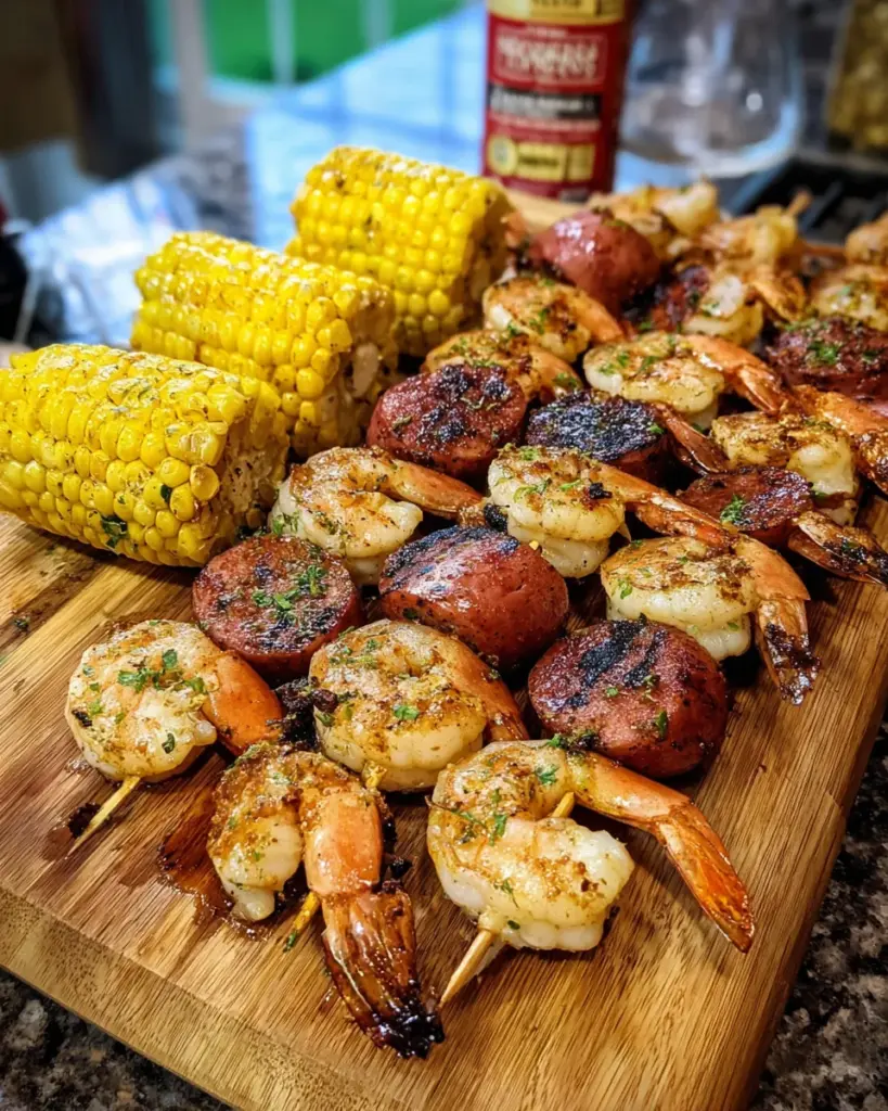 - Assemble the Skewers: Soak wooden skewers if using. Thread shrimp, sausage, potato, and corn onto skewers, brush with oil, and sprinkle with seasoning.