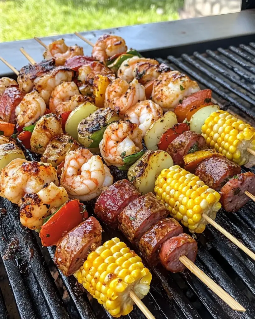 Grilled Seafood Skewers are the pinnacle of summer delight, loaded with shrimp, sausage, potatoes, and corn, all enhanced with bold flavors.