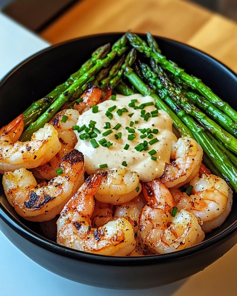 A delicious and healthy grilled shrimp bowl featuring asparagus and a creamy garlic sauce. Perfect for a quick meal or a light dinner.