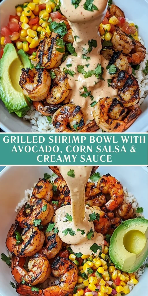 A delicious and vibrant Grilled Shrimp Bowl featuring marinated shrimp, fresh corn salsa, creamy avocado mash, and a zesty sauce.