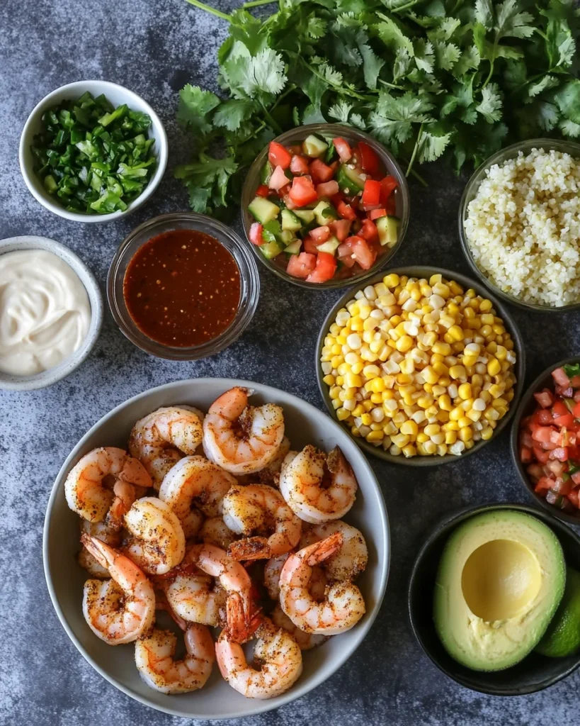 Gathering the right ingredients is the first step to creating your Grilled Shrimp Bowl with Avocado, Corn Salsa & Creamy Sauce. Here’s what you’ll need: