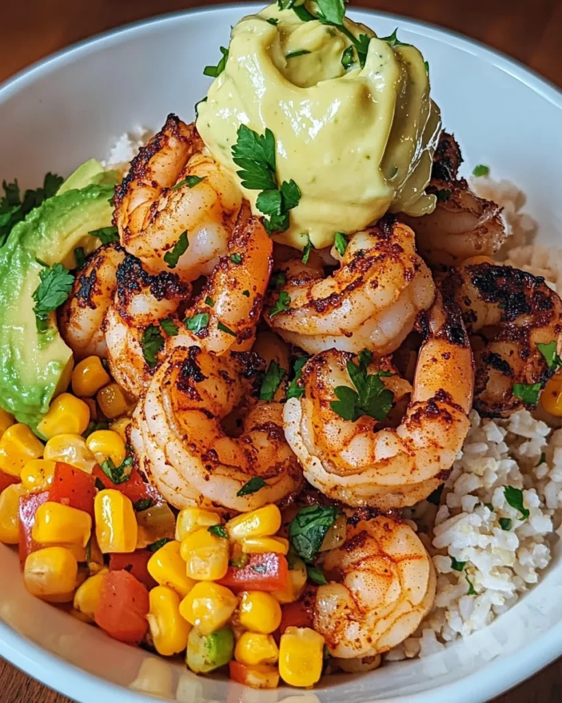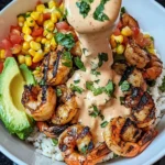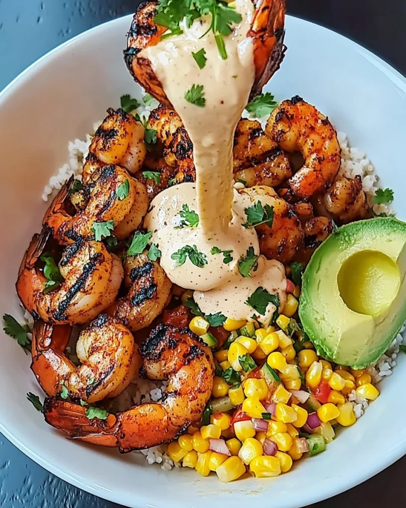 - Assemble the Bowl: Add rice or quinoa to the base of a bowl. Top with corn salsa, avocado mash, grilled shrimp, and drizzle with the creamy sauce. Garnish with fresh cilantro.