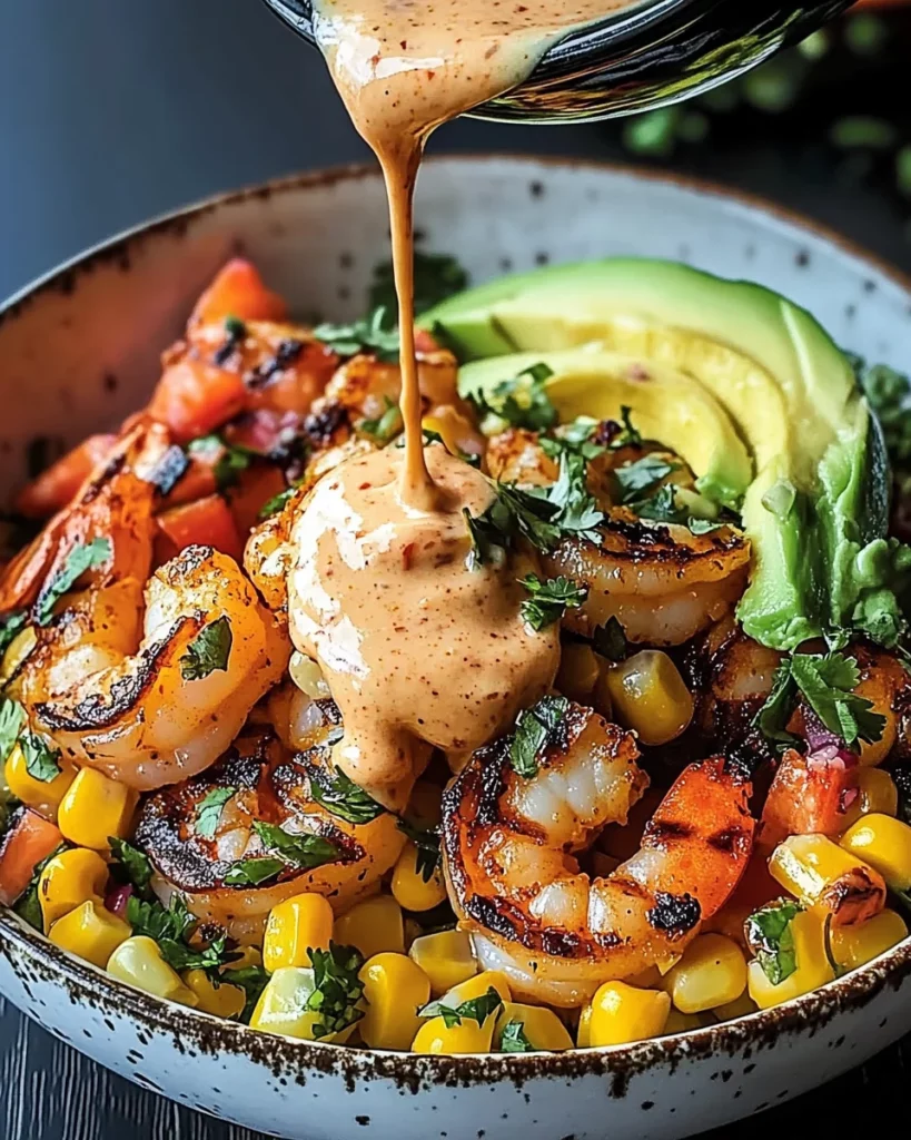 A delicious Grilled Shrimp Bowl featuring juicy shrimp, fresh avocado, and zesty corn salsa topped with a creamy garlic sauce.