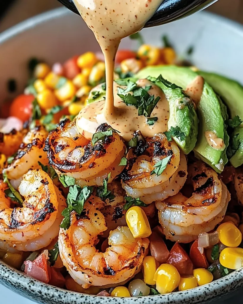 A delicious Grilled Shrimp Bowl featuring juicy shrimp, fresh avocado, and zesty corn salsa topped with a creamy garlic sauce.