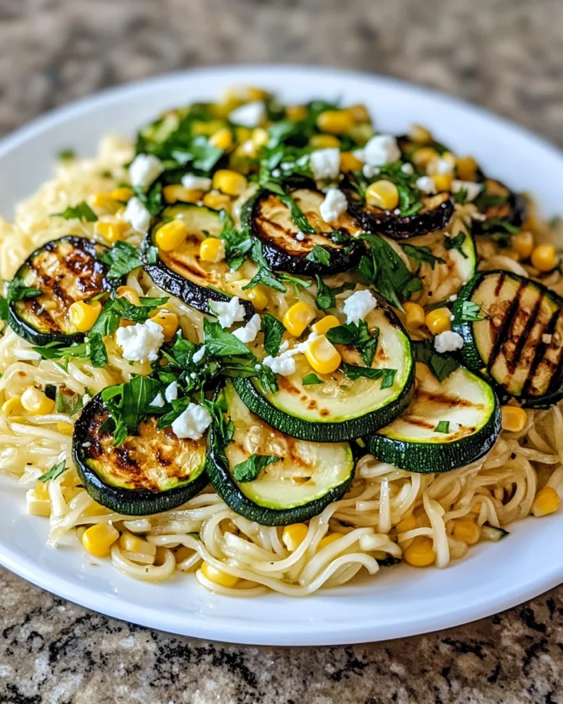 A refreshing and delicious grilled zucchini corn and noodle salad, perfect for summer gatherings.