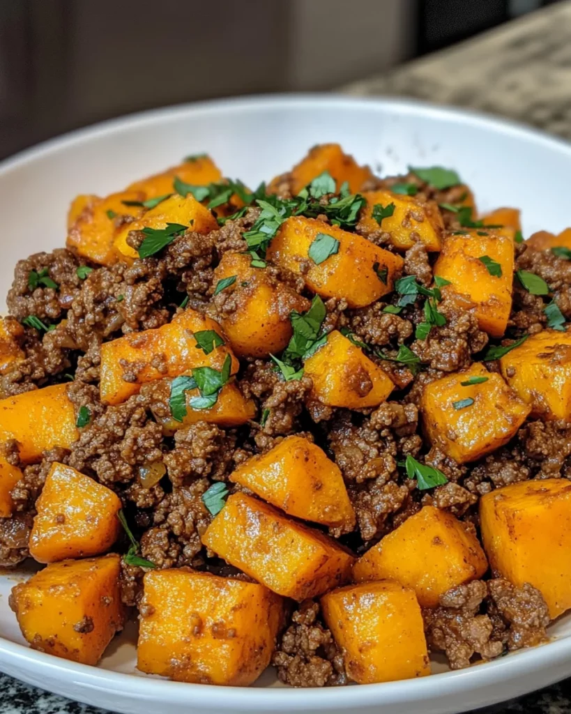 A hearty and flavorful skillet recipe featuring ground beef and sweet potatoes, perfect for a quick and satisfying dinner.