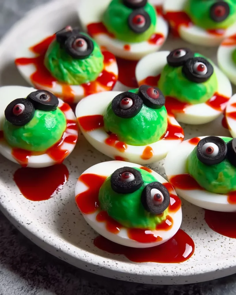 - Add the egg yolk mixture to the egg whites. Top with olives, candy eyes, and sriracha around the edges to make the bleeding eyes effect. Serve.