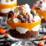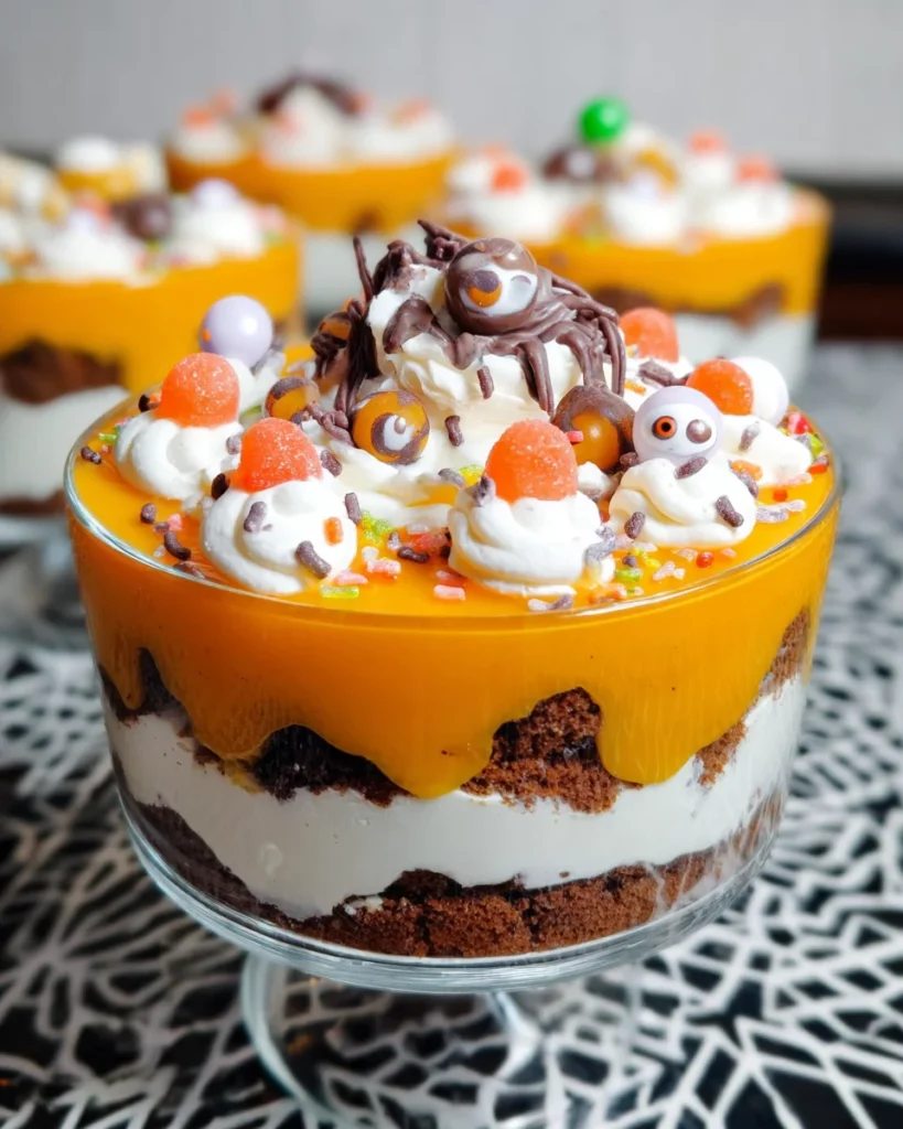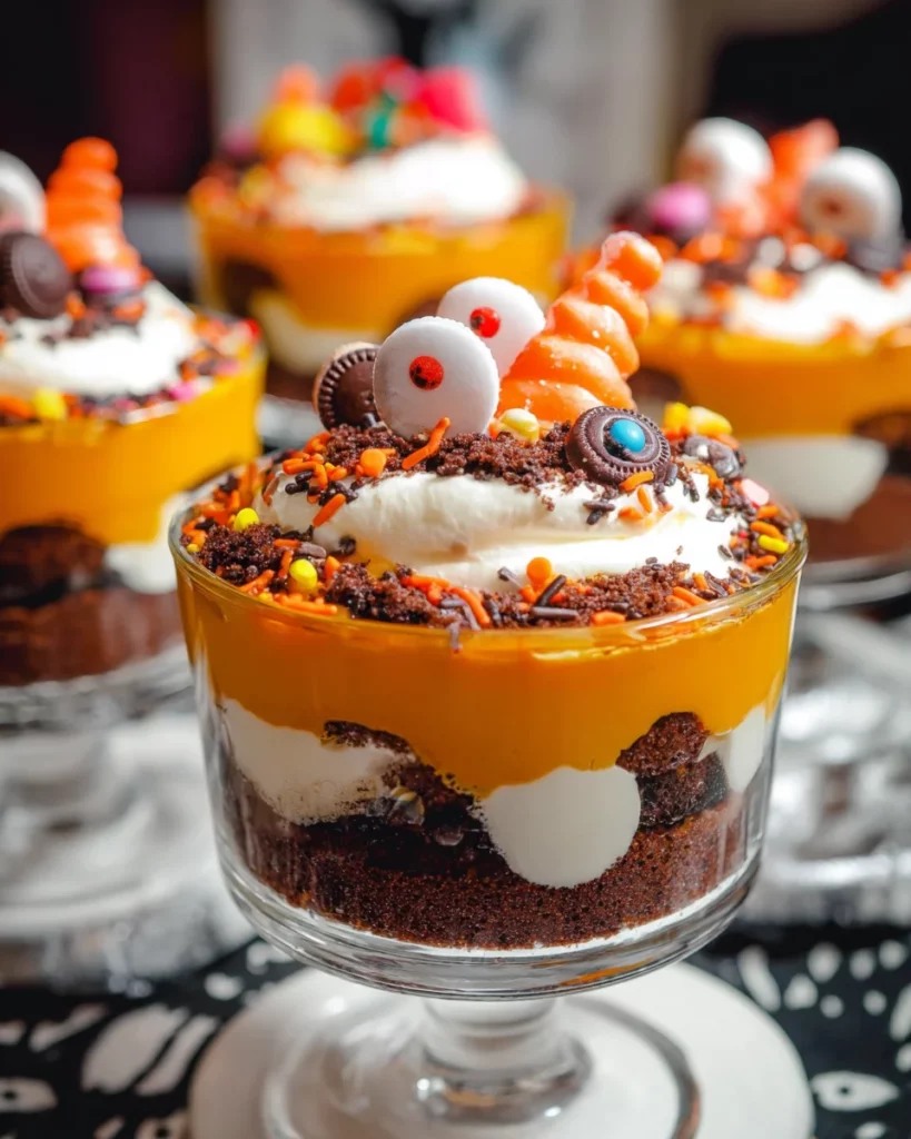 A festive and fun dessert perfect for Halloween, featuring layers of chocolate cake, creamy vanilla pudding, and whipped topping, decorated with spooky candies.