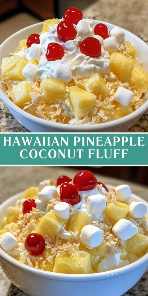Creating this Hawaiian Pineapple Coconut Fluff is like capturing a slice of paradise in your kitchen. The joy it brings is palpable, from the first stir of the ingredients to the moment you serve it to your loved ones. It’s a dessert that sparks smiles and ignites conversations, making every gathering feel special. Plus, the ease of preparation means you can focus on what truly matters—spending time with family and friends. So, whether it’s a casual weeknight or a festive celebration, this tropical delight is sure to be a hit. Dive in and enjoy the bliss!