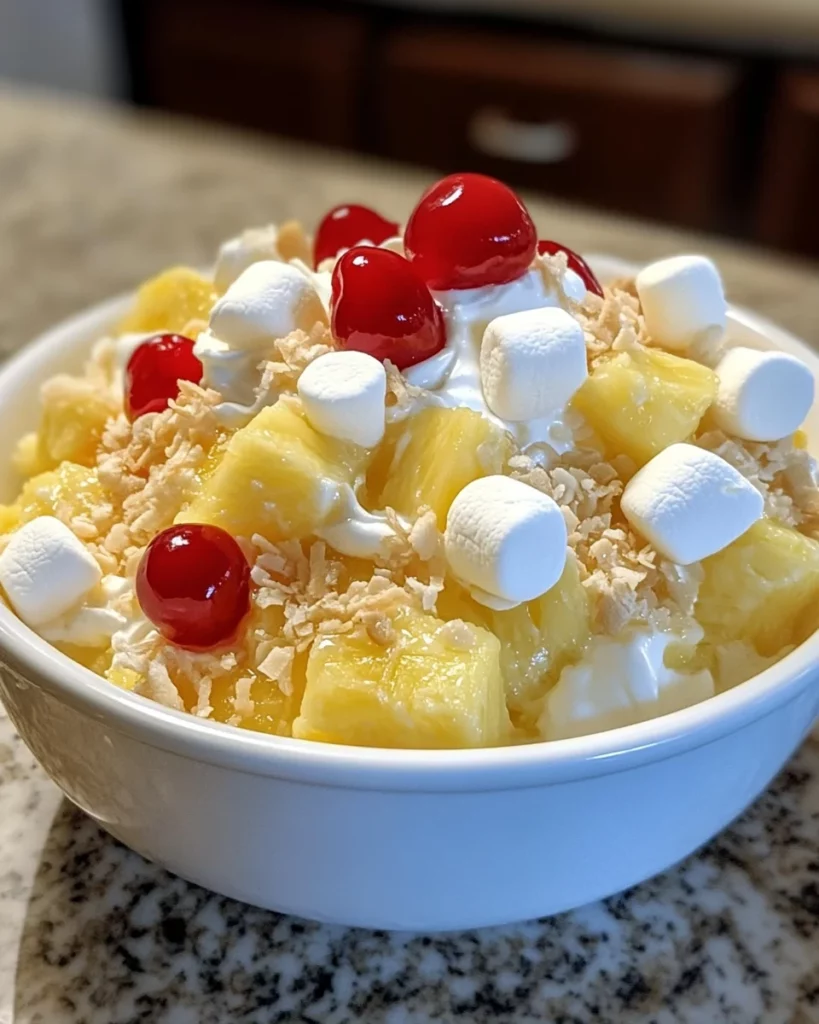 A delightful tropical dessert that combines the flavors of pineapple and coconut in a fluffy, creamy mixture.