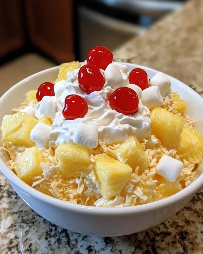 A delightful tropical dessert that combines the flavors of pineapple and coconut in a fluffy, creamy mixture.