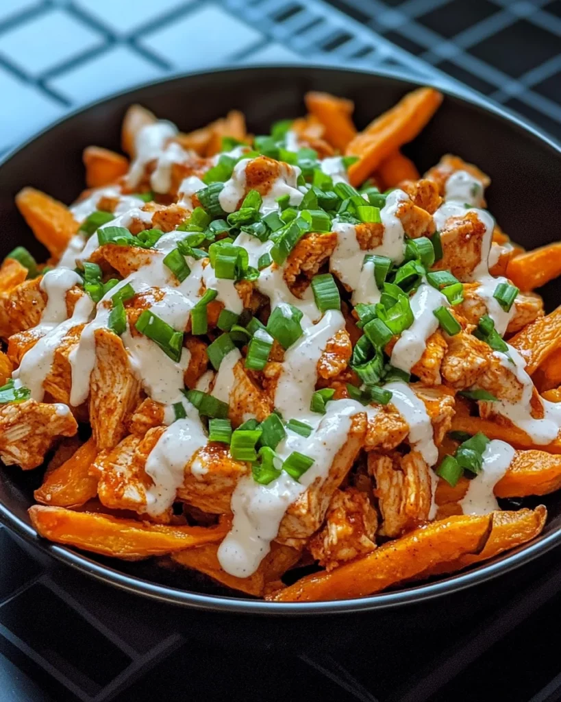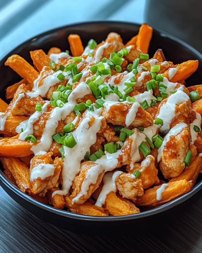 A delicious and healthy twist on classic fries, featuring crispy sweet potato fries topped with buffalo chicken and melted cheese.