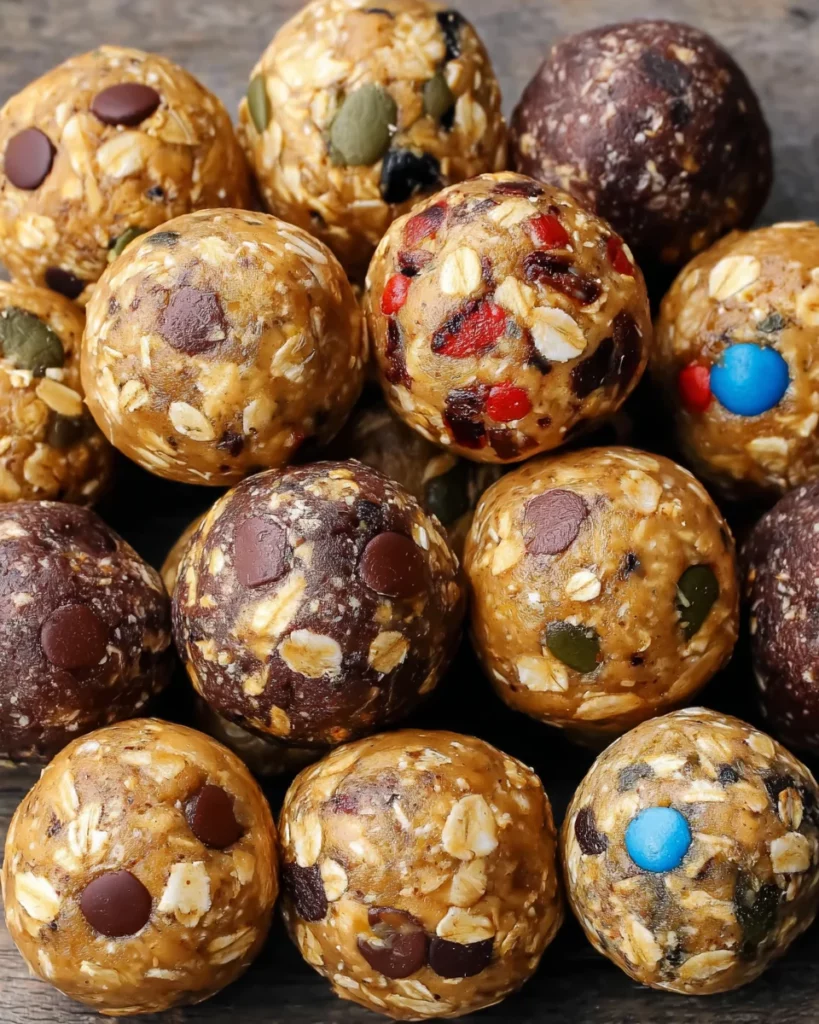 This adds color and a playful crunch, making the “Monster Cookie Balls” a hit with the kids.