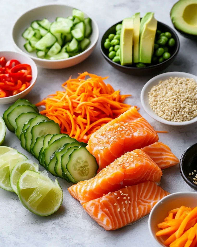 - Assemble the bowl by starting with a base of rice or quinoa, adding the salmon, and arranging the vegetables around it. Garnish with green onions, sesame seeds, and lime wedges.