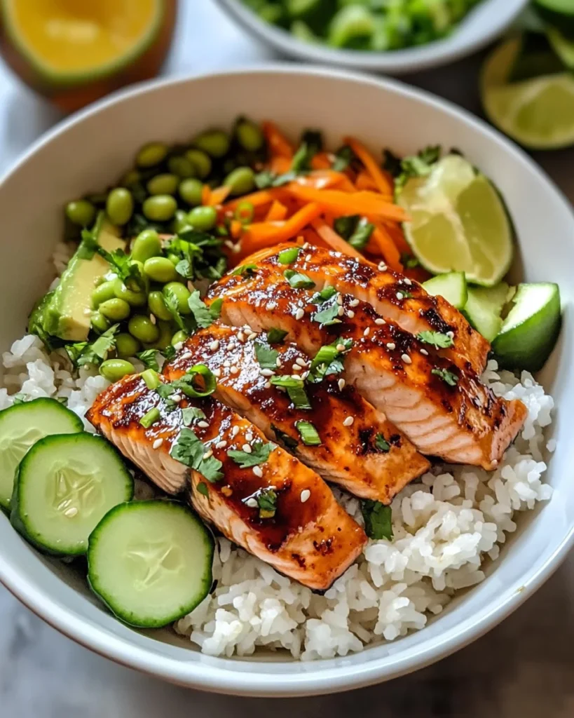- Assemble the bowl by starting with a base of rice or quinoa, adding the salmon, and arranging the vegetables around it. Garnish with green onions, sesame seeds, and lime wedges.