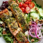 Once everything is prepped, drizzle your vinaigrette over the salad mixture and toss gently to coat. Next, divide the salad among four plates and top with the herb-crusted salmon fillets. Serve immediately, and watch as everyone digs in!