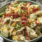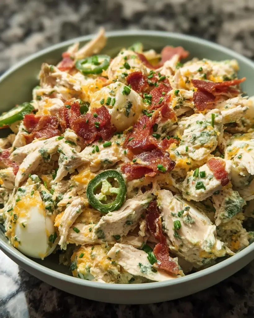 - Fold in shredded chicken, crumbled bacon, shredded cheddar, and diced jalapeños into the dressing. Mix gently until evenly coated.
