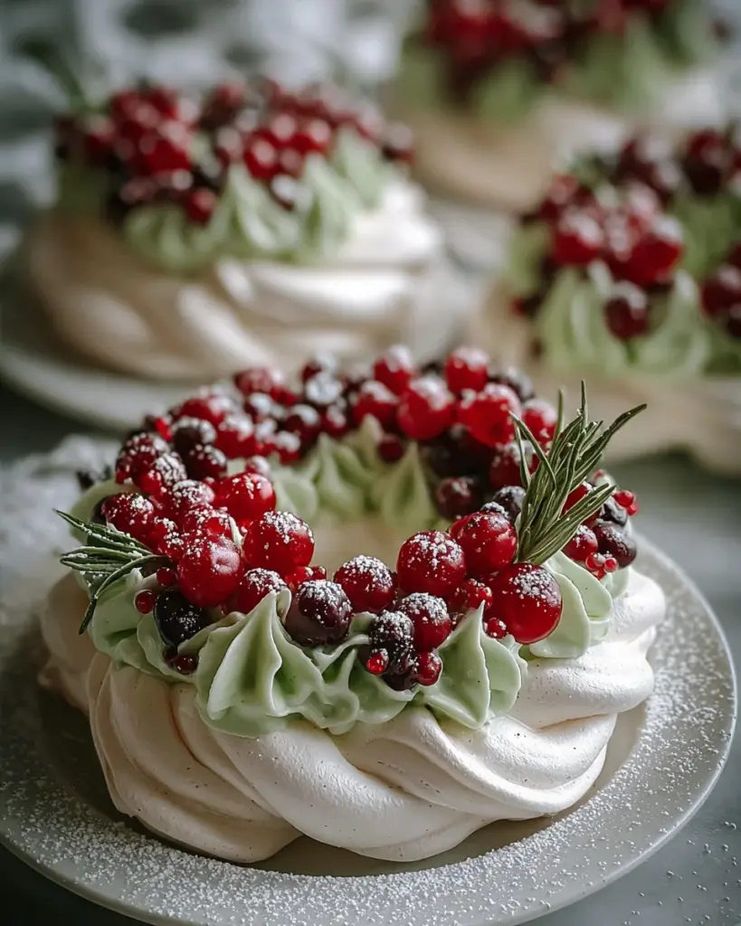 Delightful meringues shaped like holiday wreaths, filled with whipped cream and topped with fresh berries for a festive treat.