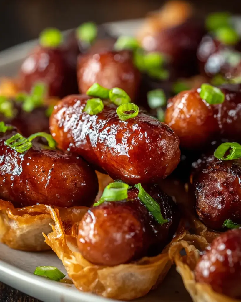 - Once the Lil’ Smokies are ready, spoon a few sausages into each pastry cup, drizzling extra glaze over the top.