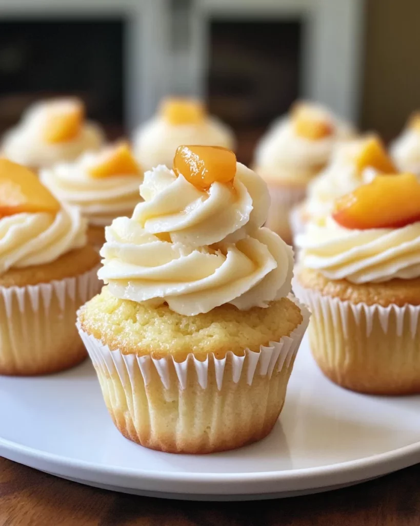 Delicious Honey Peach Cream Cheese Cupcakes topped with a creamy frosting, perfect for any occasion.