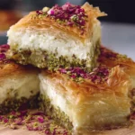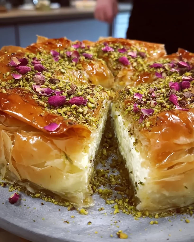 A rich and creamy cheesecake layered with crunchy phyllo dough and a delightful blend of pistachios and honey, inspired by traditional baklava.