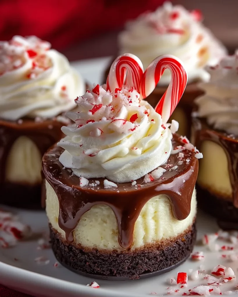 Now, it’s playtime! Pipe whipped cream on top and sprinkle with crushed candy canes for that festive touch. Add a tiny peppermint stick for extra charm. Your **Hot Cocoa Peppermint Cheesecake Bites** are ready to shine!