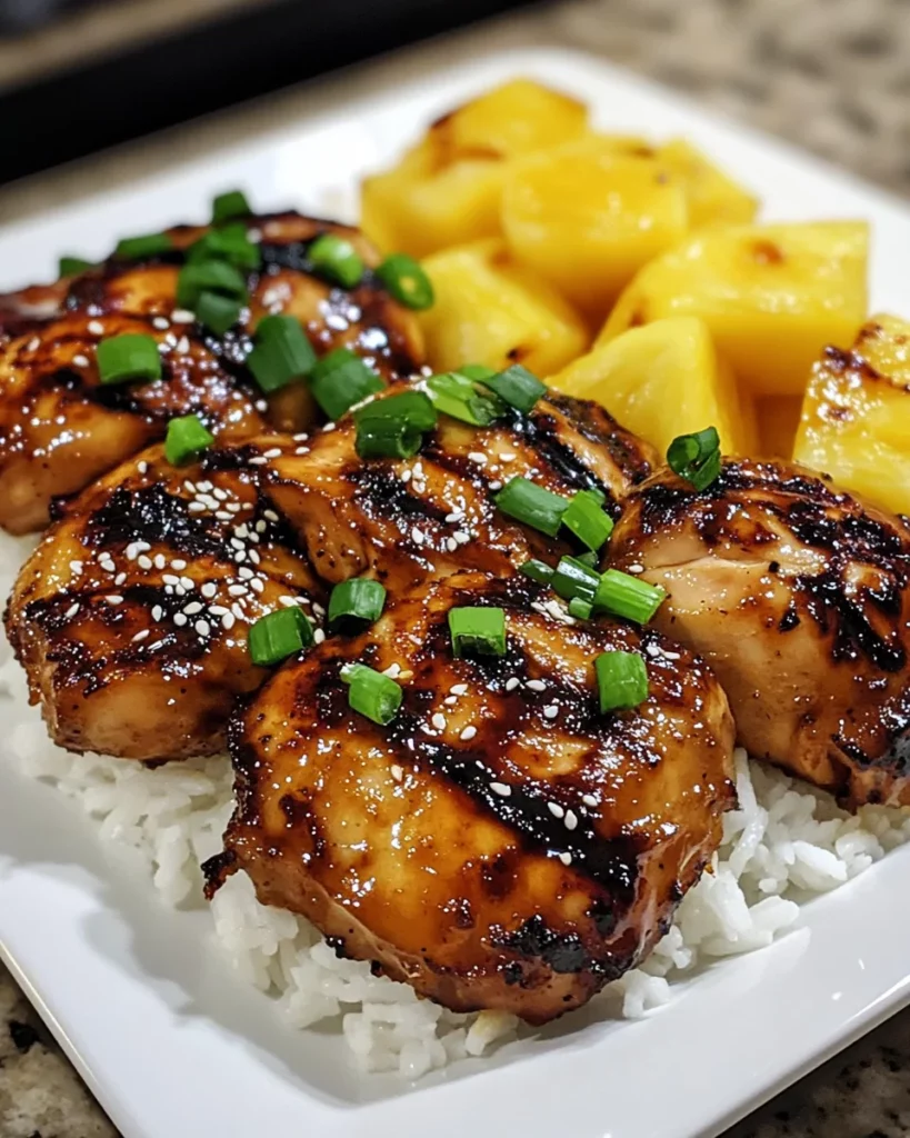 - Rest chicken for 3–5 minutes, then slice and serve over rice. Garnish with chopped green onions and add grilled pineapple slices if desired.