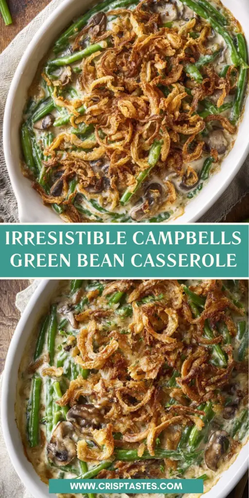 Cooking is more than just a necessity; it’s a way to bring joy and comfort into our homes. Whenever I prepare the *Irresistible Campbells Green Bean Casserole*, I’m reminded of laughter-filled gatherings and warm family moments. Each creamy, crunchy bite brings back memories and creates new ones. Whether it’s a holiday or a Tuesday night dinner, this dish effortlessly adds magic to any table. I hope this recipe inspires you to bring a bit of culinary love into your home. Trust me, your family will thank you—and maybe even ask for your secret ingredient!