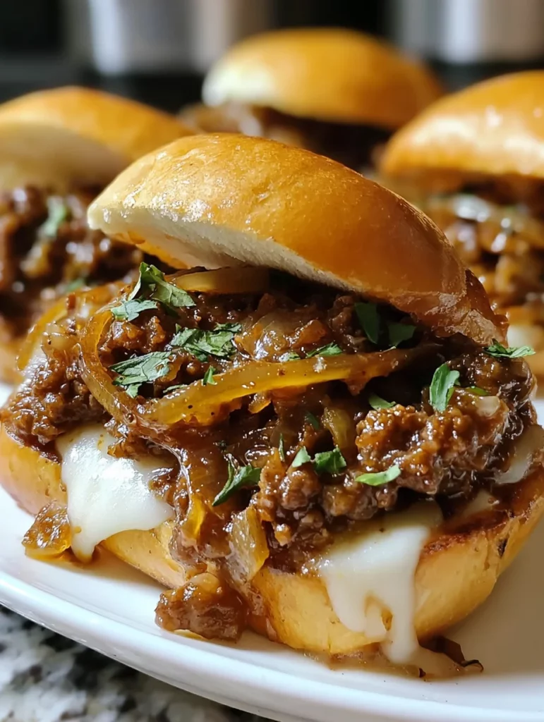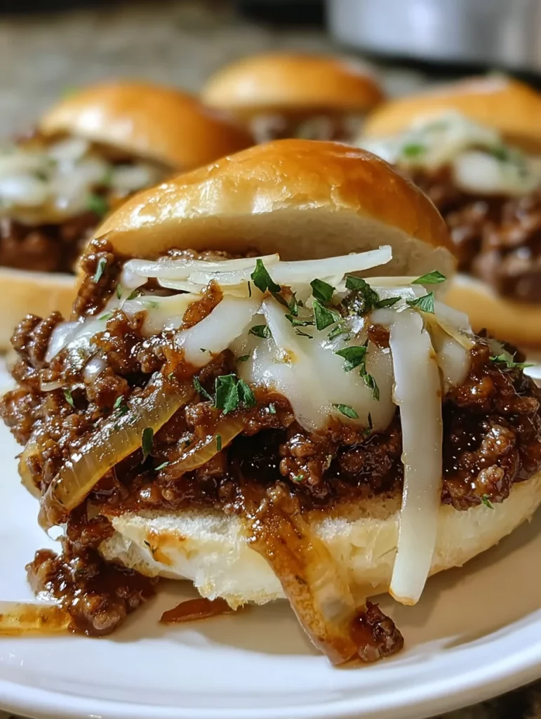 A delicious twist on classic sloppy joes, featuring rich flavors of French onion and melted Swiss cheese.