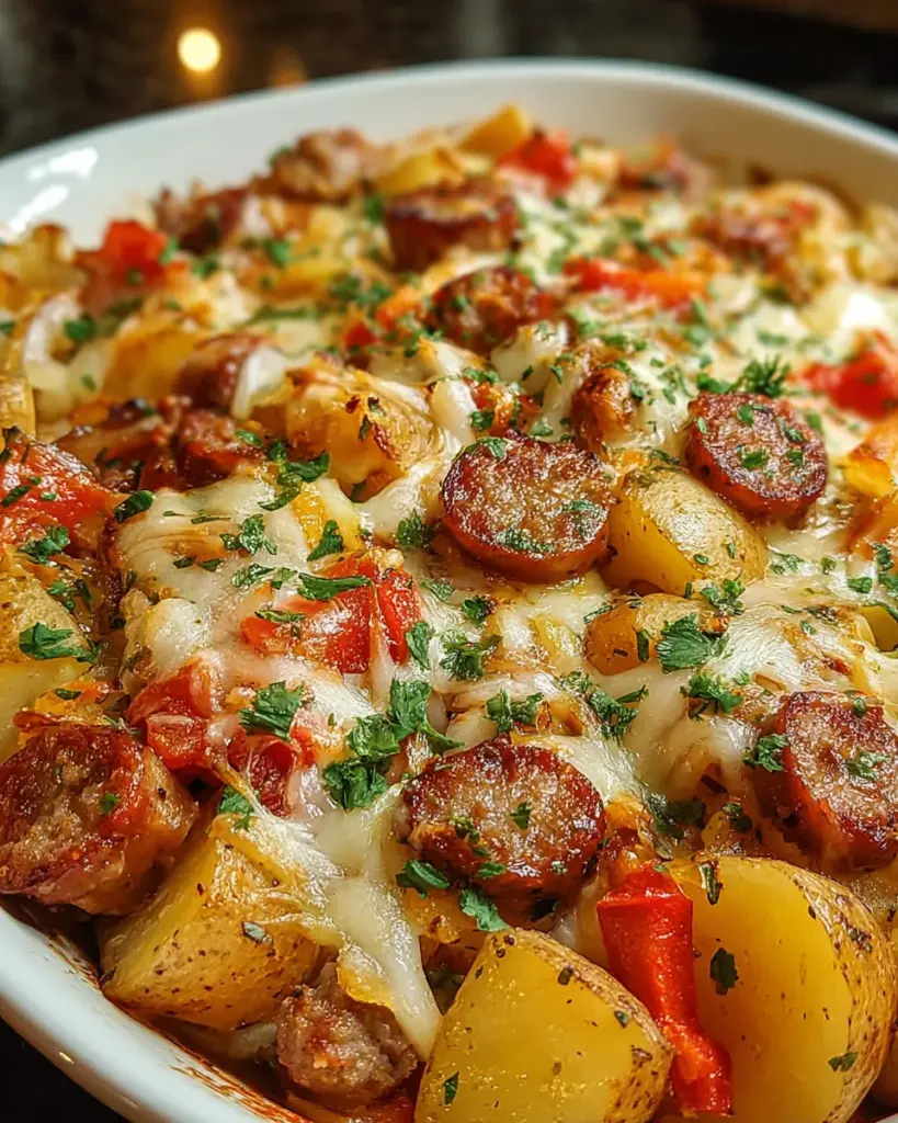 A hearty and comforting casserole featuring Italian sausage and layered potatoes, perfect for a cozy meal.
