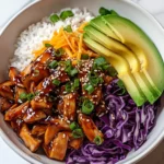 Next, layer on that flavorful jackfruit, letting it tumble artfully over the rice. Then, pile on the shredded red cabbage for a pop of color and crunch. Finally, add those creamy avocado slices on top. Feel free to get creative! You can arrange the toppings in a rainbow pattern or just slap them on there—either way, it’ll look fabulous!